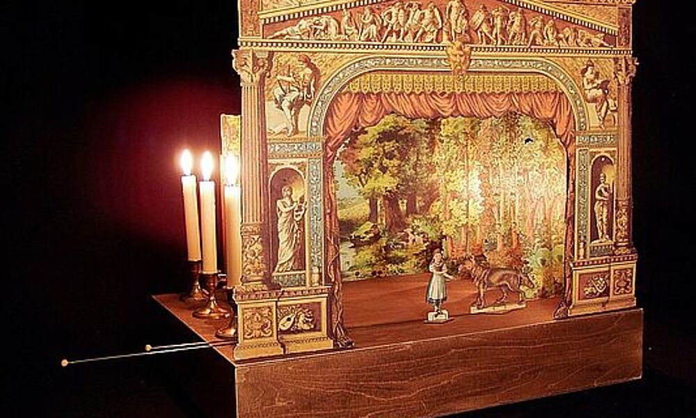 Vi hygger os i aktivitetsrummet på Konsul Ørums gård, og museets formidler viser sjovt gammelt legetøj, bl.a. det flotte blå Pegasus-teater, som snart fylder 85 år.