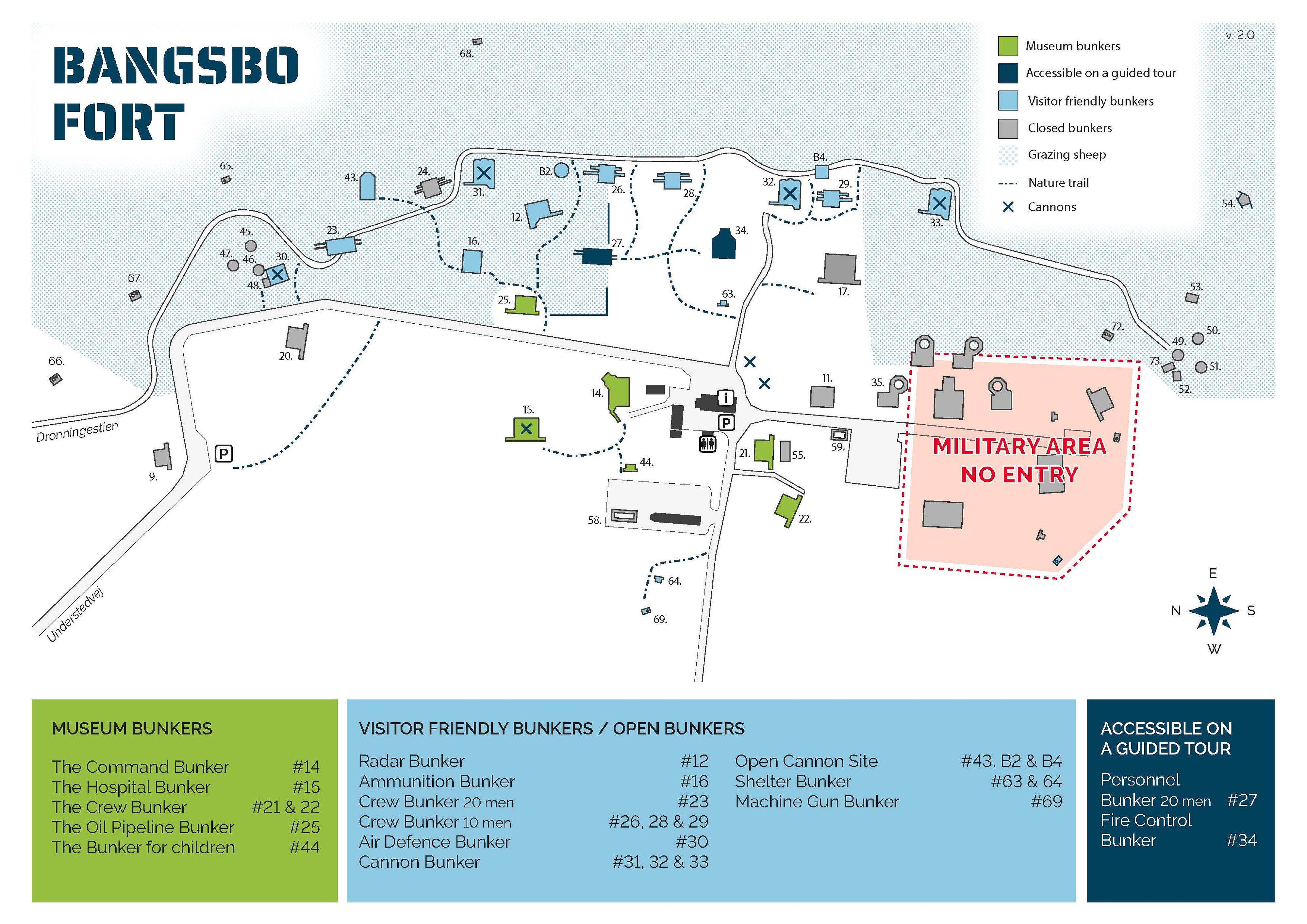 There are still approx. 80 concrete constructions at Bangsbo Fort – 70 of which are bunkers. Some of them are still used by the Danish Navy. The greater part, however, are used by the museum and they are continuously being fixed and used for different purposes. In 2025 the situation is as follows,